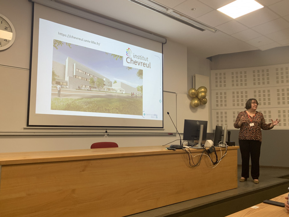 Au sein de l’amphithéâtre Francis PETIT (promotion 1966), Rose-Noëlle VANNIER a ensuite présenté les évolutions de l’école comme l’intégration au sein de Centrale Lille Institut et le développement de l’institut Chevreul. Maelle DUQUOC (promotion 2003), présidente de notre association, a également évoqué les missions de l’association et nos activités à venir tel que le forum carrière du 23 novembre 2025, nos publications (un mémoire sur l’école et l’association en train d’être finalisé et un recueil de 120 portraits de diplômés de l’école) et la mise en place du mentorat.